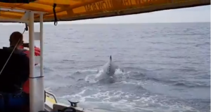 Want opeens komt ze een paar haaien tegen waarvan er eentje wel heel nieuwsgierig is...