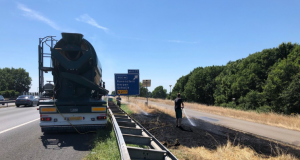 Vrachtwagenchauffeur blust bermbrandje langs de snelweg