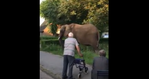 Dit zie je niet vaak zo los lopen midden in het dorp in Nederland. Deze olifant is namelijk op avontuur gegaan en loopt lekker...