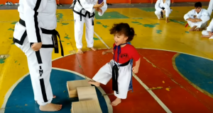 Je kent het wel bij die vechtsporten waarbij het dan de bedoeling is dat ze met hun hand of voet een plank door midden...